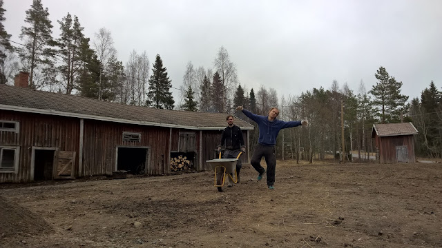 Eilen oli niin tehokas päivä, että oksat pois! Frans ja Antti touhusivat talolla 12 tuntisen päivän ja kaikki on nyt valmista hirsien vaihtoa varten. Ulkolaudoituskin lähti hujauksessa. Itse pääsin paikan päälle vasta iltapäivällä, siivoilemaan jälkiä ;)